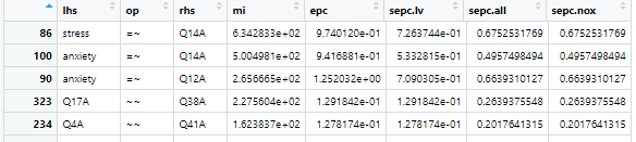 mod.ind <- modificationindices(fit.dass, sort = T)