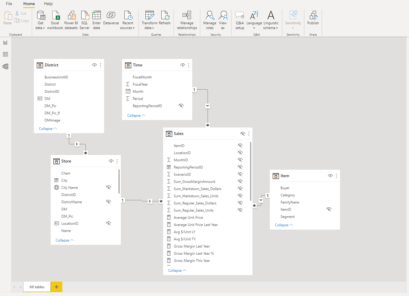 There are three main views in PowerBI that allow the user to understand their data and create a dashboard. The “model” window provides a graphic overview of the relationship between all of the tables and variables in the dataset. The dataset we will use has five separate tables, and each table is related to one other table with one variable.