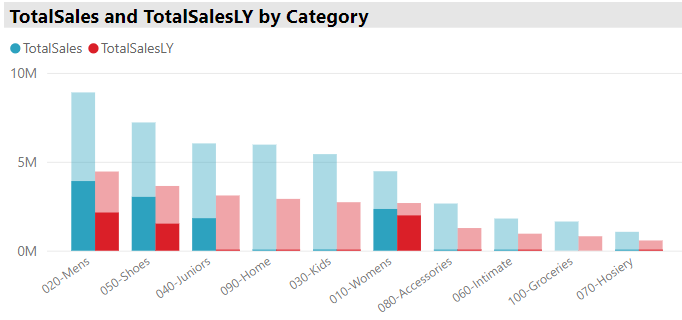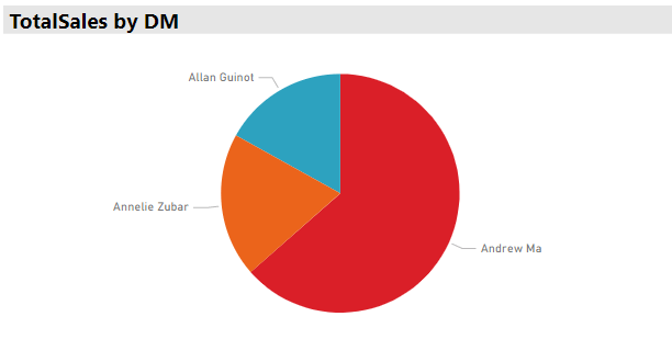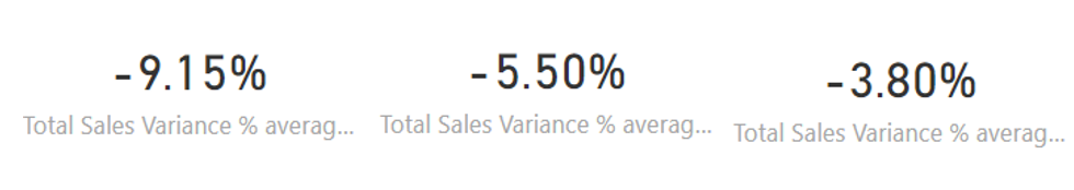 We can then add a card to our dashboard that shows a manager’s average total sales variance over the entire year. Note that this calculation will take the average of whatever is selected on the slicer, so if we have three managers selected it will take the average all three managers’ total sales variance. Probably better to select one at a time. Using our new measure we can see that Allen does has a noticeably lower total sales variance than the Andrew and Annelie, and that Annelie is performing the closest to her sales expectations. Perhaps we need a meeting with Andrew….