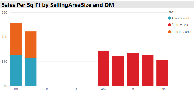 In terms of our three managers we can see that Andrew runs only larger stores, while Allan and Annelie exclusively operate stores under 20,000 sq. ft. This could be due to a number of factors such as experience, past performance at certain store sizes, or geographic location.