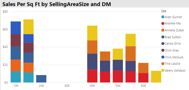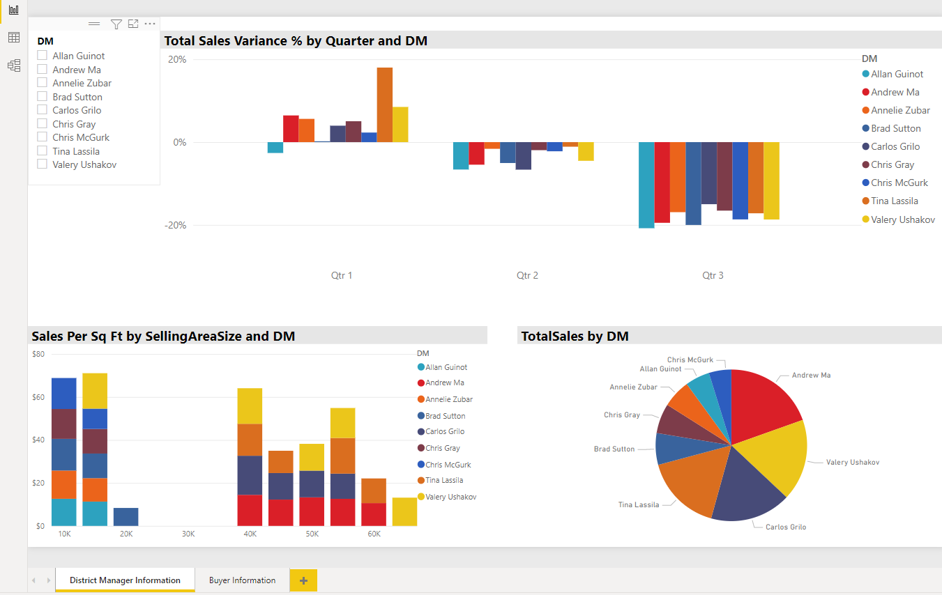 Alright, let’s focus on the “Report” window and see what these visualizations can tell us about what’s going on with this retail business. The image above is a set of visualizations focused on understanding the performance of the nine district managers in this company. Notice there is a slicer that we can use to select any number of managers, making it easier to focus on just one, or to easily compare the performance of multiple managers.