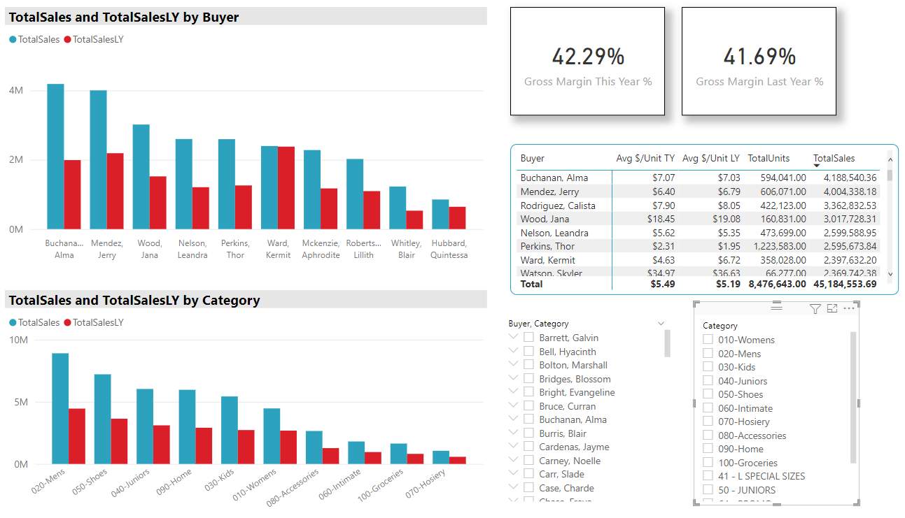 On this dashboard the two graphs compare total sales from last year and this year by buyer and by category. The cards give the gross margin last year and this year, the tables provides a few more pieces of useful information about the buyers, and the slicers can filter the data by buyer or by item category. A couple of things to note. The total sales by buyer graph is set to only display the top 10 buyers at any one time (all categories are included in the total sales by category graph), and the table is sorted in descending order by total sales.