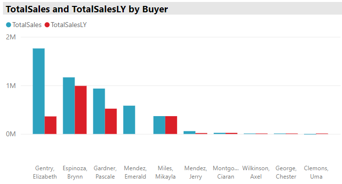 There are many questions we could investigate using this dashboard, so we will just focus on a couple. Let’s say our company wants to start focusing more on kids clothes. When we filter the dashboard to view only sales of kids clothing and we see that Elizabeth stands out this year as the top buyer. Not only was she the top buyer of kids clothing this year, she went from about $350,000 in purchases last year to almost $2 million in purchases this year. We might want to get in touch with her to see what she is doing differently this year which has resulted in such a large increase in kids clothing purchases.