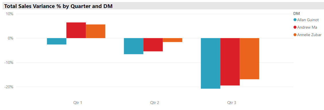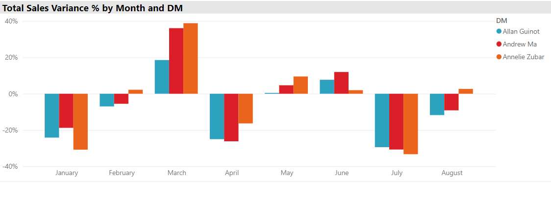 PowerBI has a feature that assigns a hierarchical structure to dates which allows us to move up or down that hierarchy to view our data from smaller or larger grain sizes. We can now see that quarter 1 was the best quarter mainly because in March all managers beat their sales estimates by a large margin, and quarter 3 was so poor because in July sales fell quite short of estimates. We can also see that compared to his peers Allen did not do nearly as well in March, resulting in his missing sales estimates for quarter 1. Well, it just so happens that in our fictional example Allen went on a long vacation during March and was not around to monitor his staff.