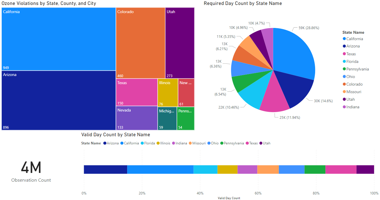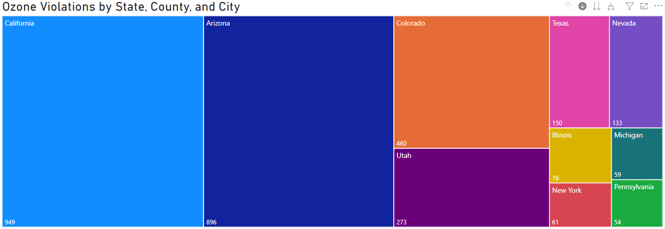Now instead, maybe we now want to design a visual for a public facing website that gives viewers specific information about the number of times ozone pollution has exceeded EPA standards by state, county, and city. A Treemap with a hierarchical structure does this quite well. There is a page level filter for ozone, and the treemap includes the ten states with the most ozone standard violations. Using the drill-down function we can see which counties and cities in these states are the largest contributors.