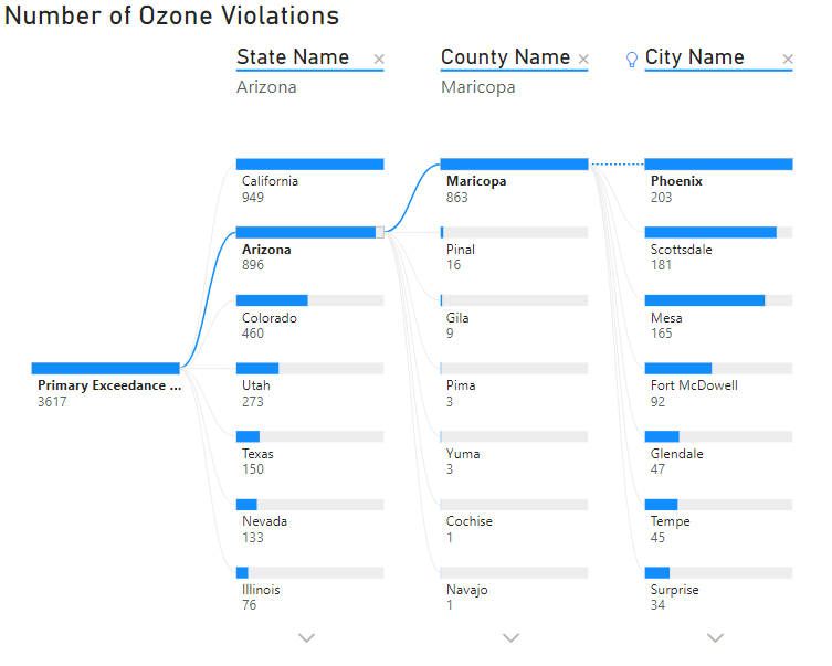 Finally, let’s imagine we want to communicate the number of ozone violations with other EPA researchers who are familiar with the general trends of the data and really need to understand which states, counties, and cities have the most violations at a specific and fine grained level. A decomposition tree is a good choice here.