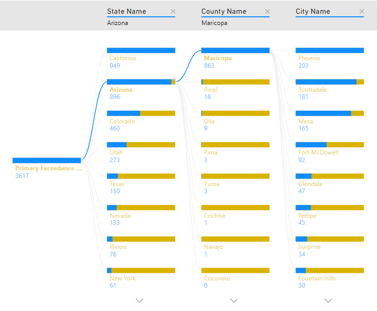 Since each state, county, and city is ranked from largest to smallest the viewer can quickly identify top contributors to standard violations at the state, county, and city level. We can see that almost all of Arizona’s violations can be attributed to Maricopa county, specifically Phoenix, Scottsdale, and Mesa. Insights such as this would be much more difficult using a geographical map or treemap.