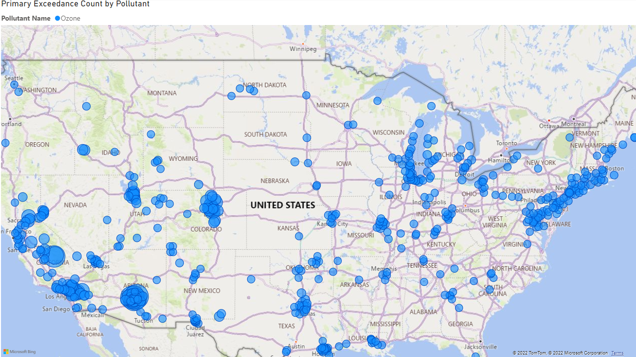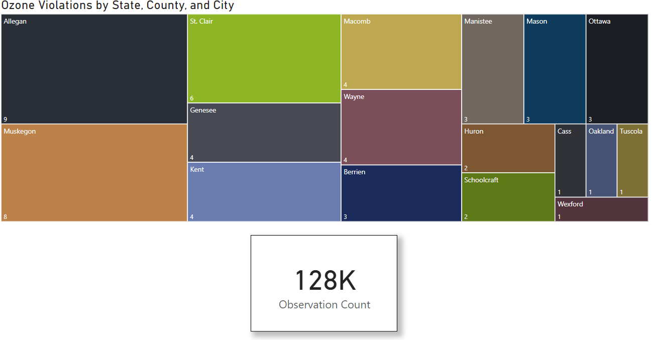 The image above has a page level filter for ozone. It is currently drilled down to the county level in Michigan to show the number of times in each county that Ozone levels exceeded the threshold value. The card at the bottom displays the total number of times Ozone levels were recorded in Michigan during 2021. This dashboard leaves an appropriate amount of whitespace, and clearly and succinctly tells a story about ozone exceedance at the state, county, and city level. Compare to the dashboard below.